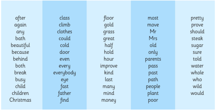 When supporting your child please encourage your child to use their phonic knowledge e.g. play contains the phonemes p l ay. The Common Exception Words will contain exceptions to the current phonic rules your child knows e.g. in "said" they will know the phonemes for the graphemes "s" and "d" but the exception will be the grapheme "ai" making the phoneme "e".